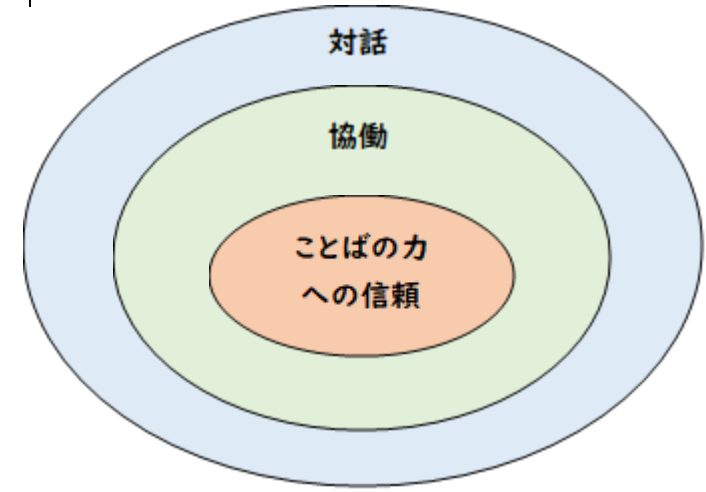 このようなことばの力は、他者と協働することをとおし、発現する。協働とは、あるコミュニティにおいてお互いが対等な存在であるという認識のもと、対話のプロセスをとおし、お互いにとって有益であると思える新たな認識・知識を創造することである。こうした協働という行為を成立させるために、個々の参加者には次のような態度が求められる。